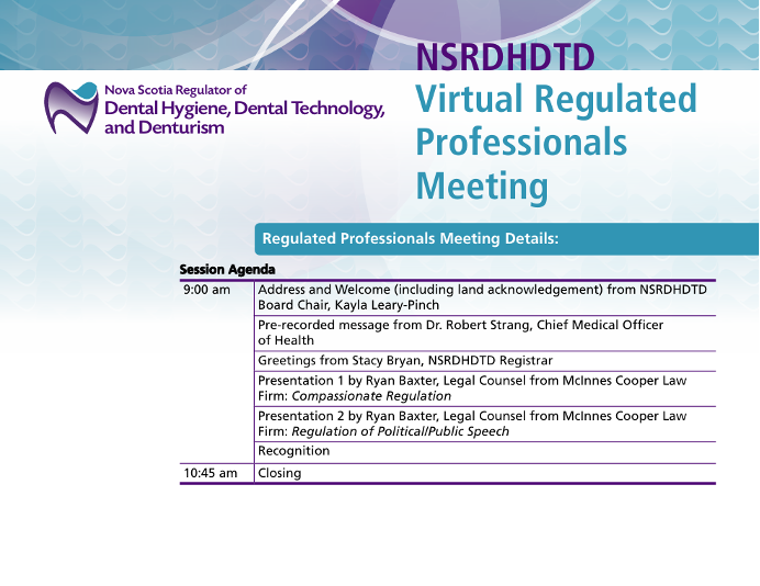 Further details are published in the Regulated Professionals Meeting brochure that was circulated to all NSRDHDTD regulated individuals.